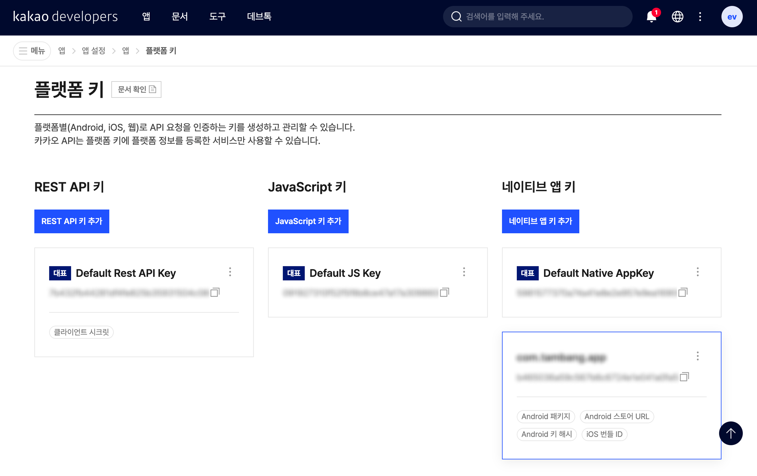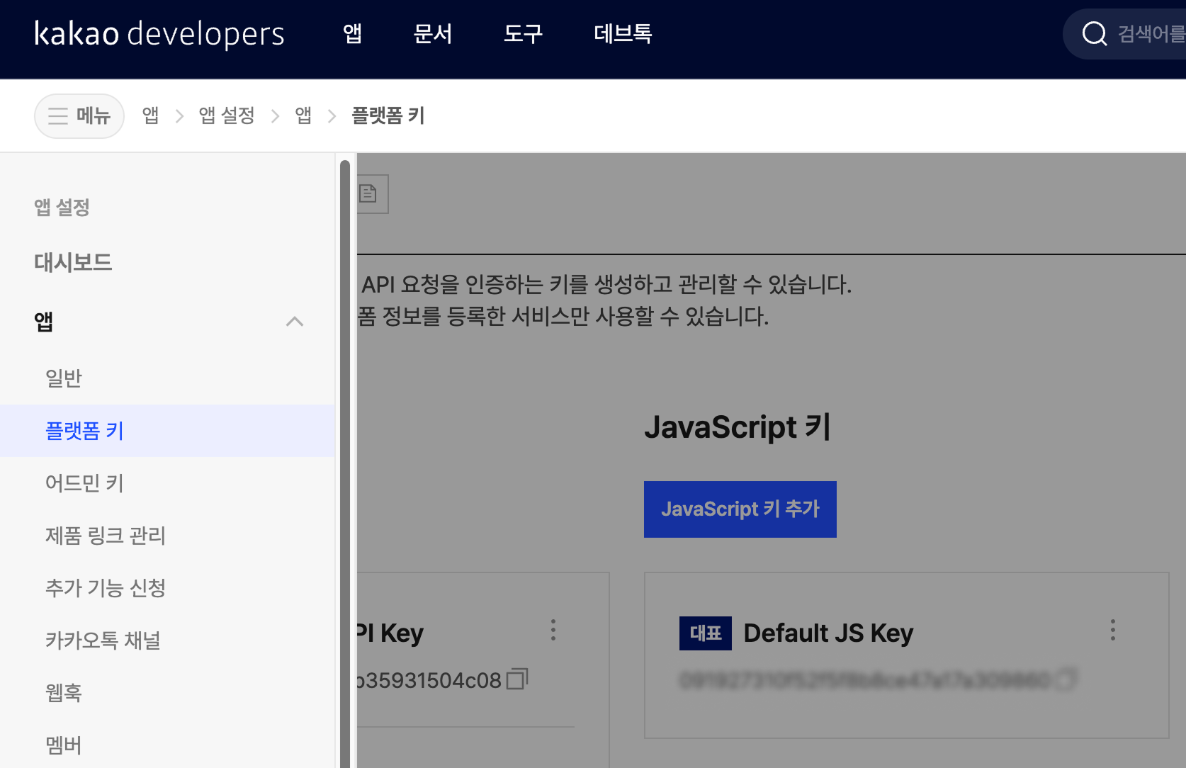 [앱 설정 > 앱 > 플랫폼 키] 메뉴로 들어가줍니다.