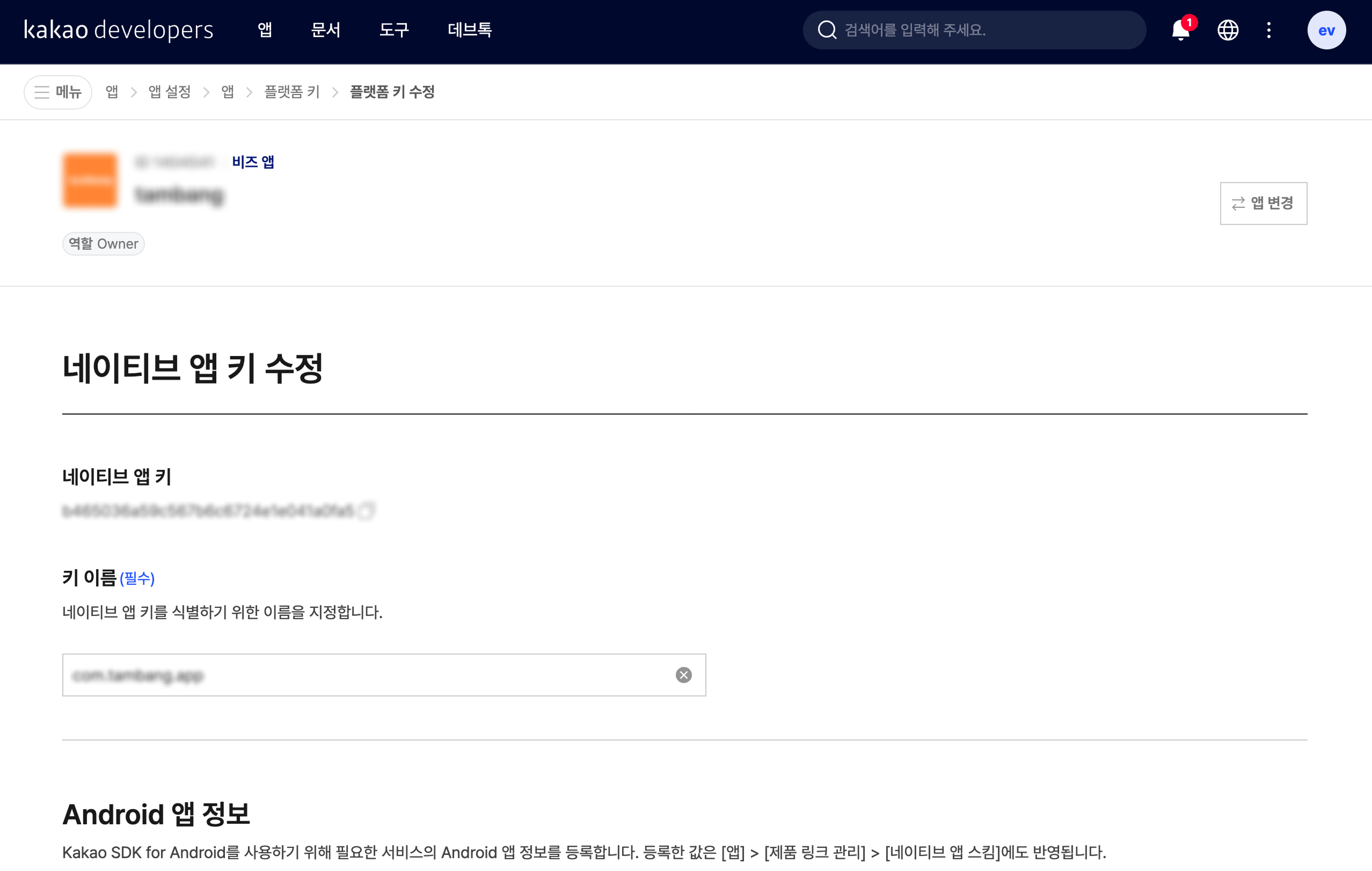 네이티브 앱 키로 들어가줍니다.