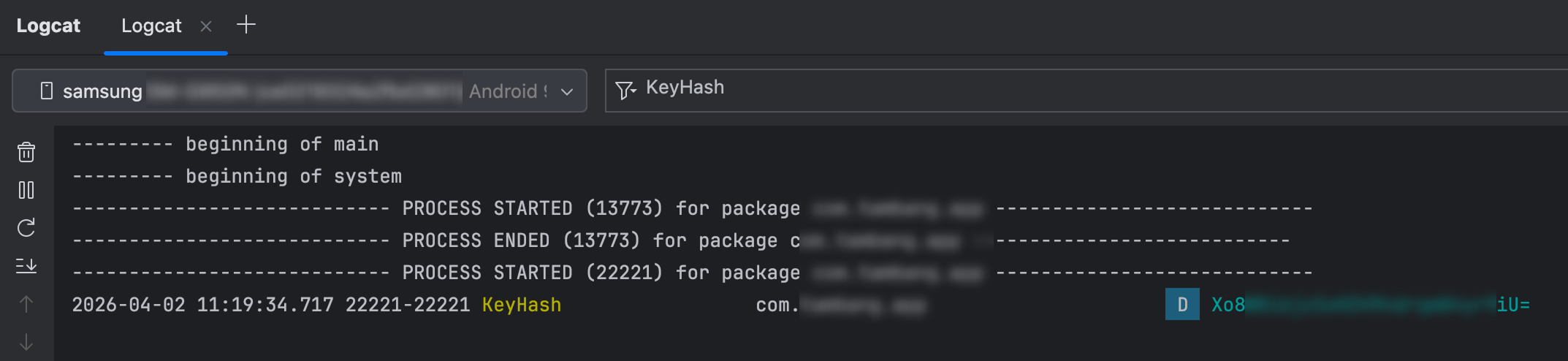 Logcat에서 xxxxxxxxxxxxxxxxxxxxxxxx= 같은 문자열이 출력됩니다.