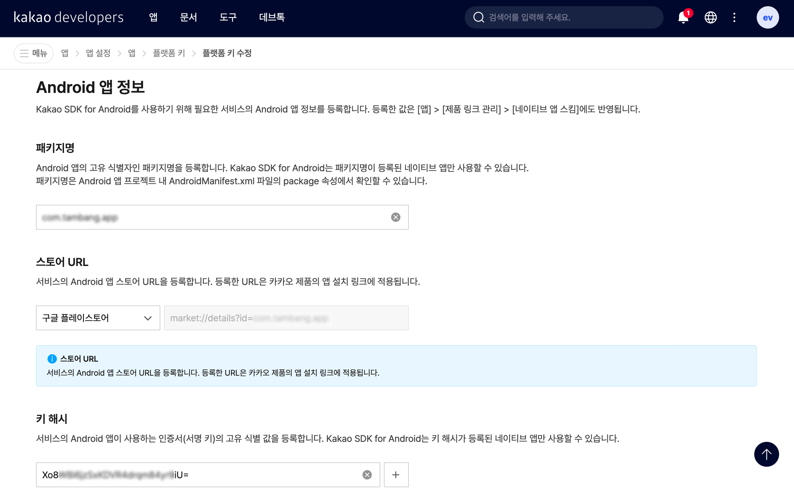 스크롤 해서 Android 앱 정보에서 ‘키 해시’를 찾아줍니다.