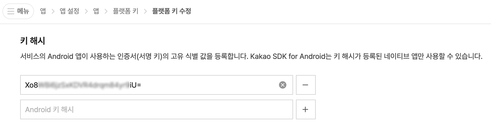 - 카카오 개발자 콘솔 → 앱 > 앱 설정 > 앱 > 플랫폼 키 > 네이티브 앱 키 → Android 앱 정보에서 키 해시 추가