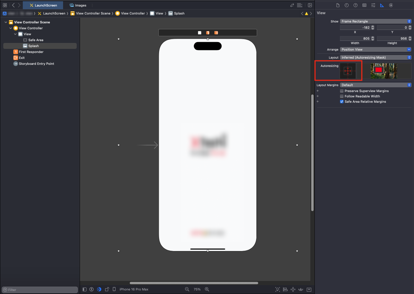그 후 오른쪽 툴바에서 Autoresizing을 사진처럼 가로세로 둘 다 가운데 정렬로 맞춰줍니다.
