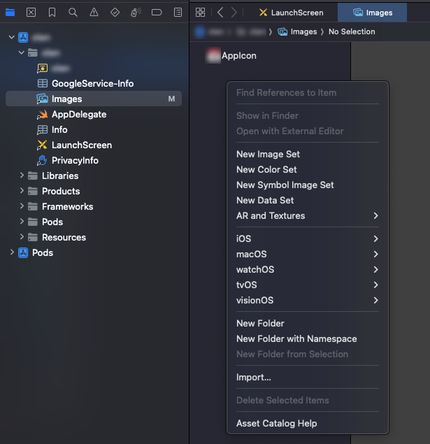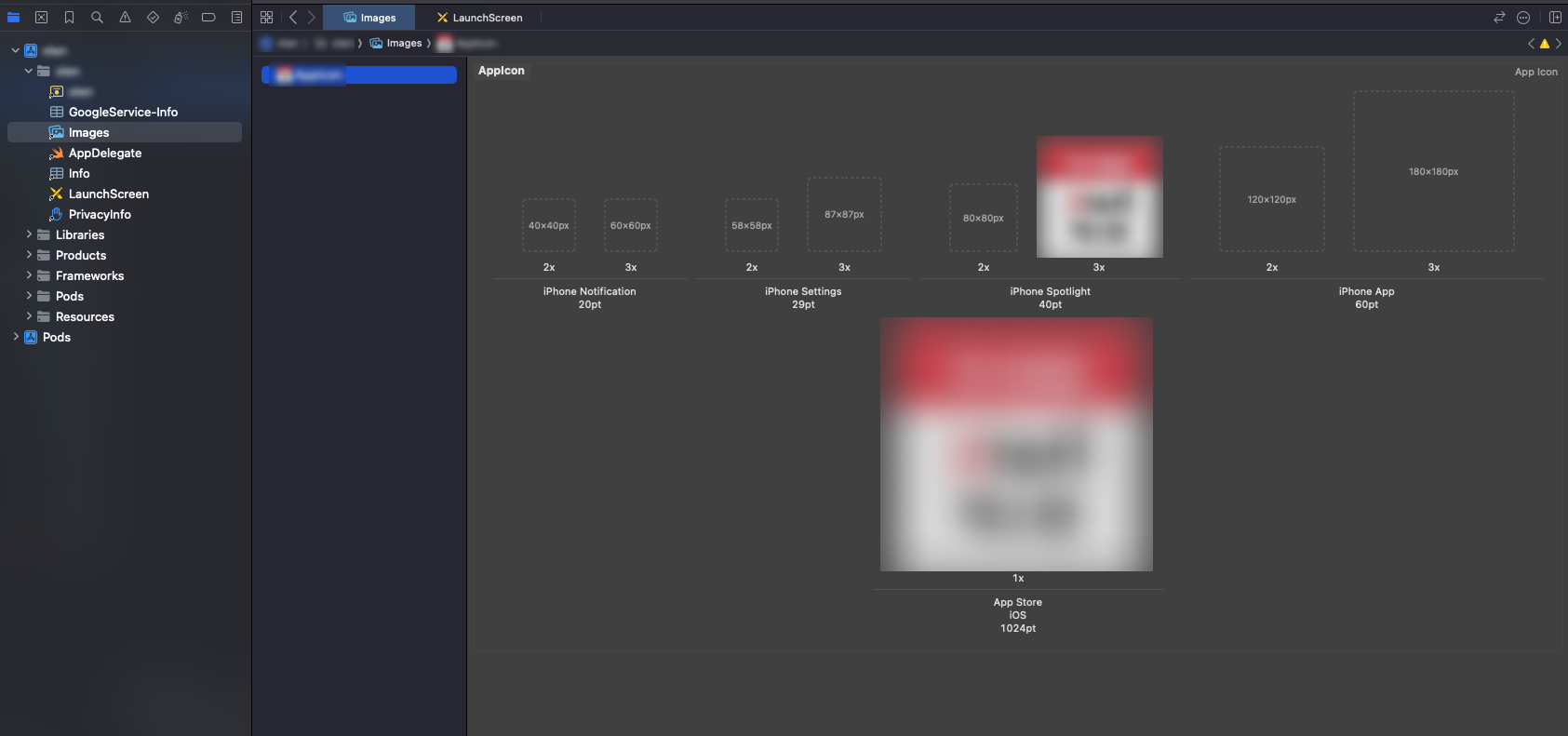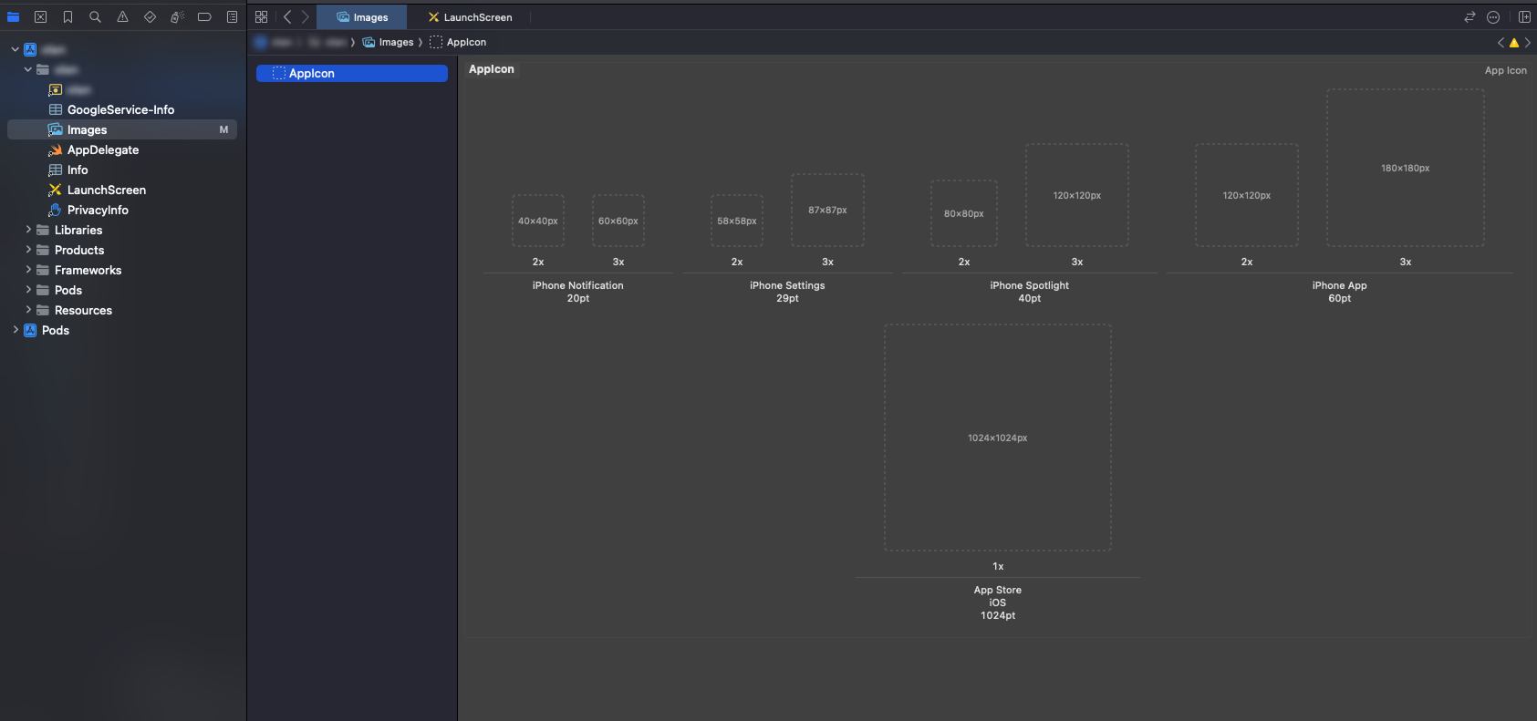 앱 아이콘은 Xcode의 Images에서 쉽게 설정할 수 있다. 클릭하면 위 사진처럼 AppIcon을 설정할 수 있는 화면이 보인다